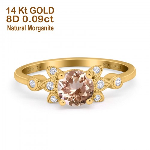 14K Yellow Gold 1.37ct Round 7mm G SI Natural Morganite Diamond Engagement Wedding Ring Size 6.5