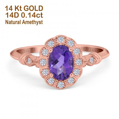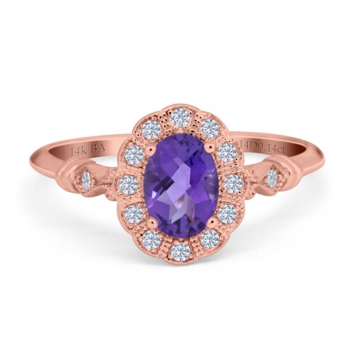 14K Rose Gold 0.9ct Oval 7mmx5mm G SI Natural Amethyst Diamond Engagement Wedding Ring Size 6.5