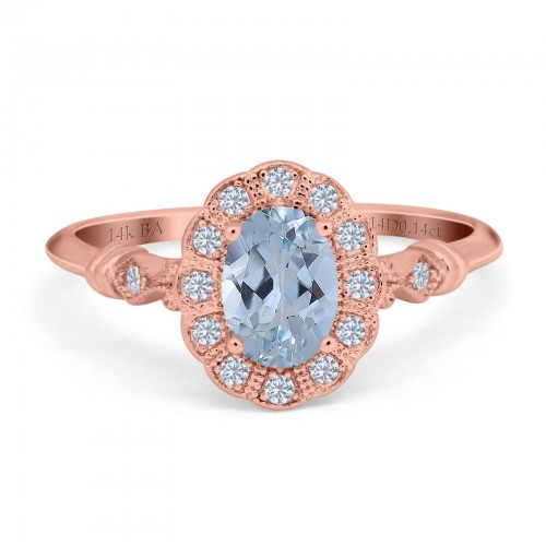 14K Rose Gold 0.9ct Oval 7mmx5mm G SI Natural Aquamarine Diamond Engagement Wedding Ring Size 6.5