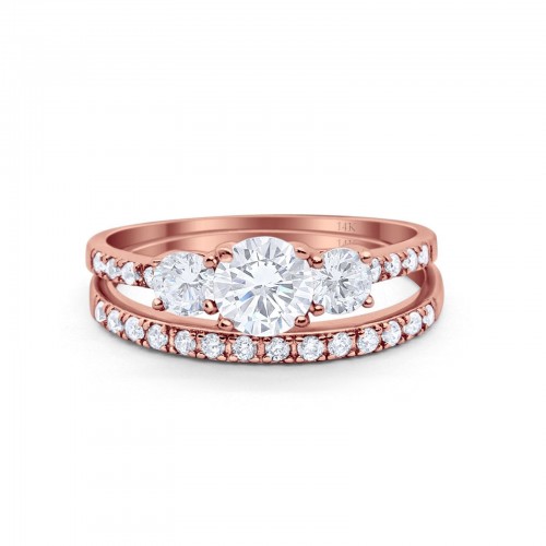 14K Rose Gold Round Three Stone Piece Wedding Bridal Set Ring Band Engagement Simulated CZ Size-7