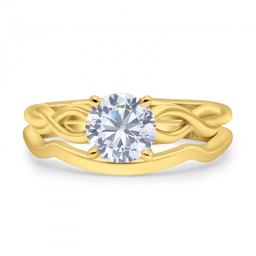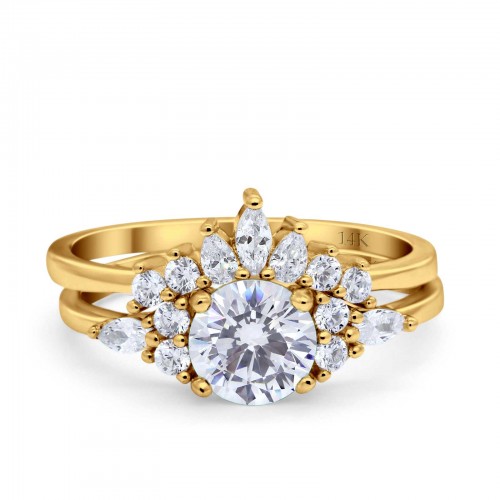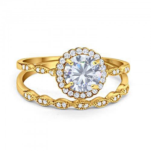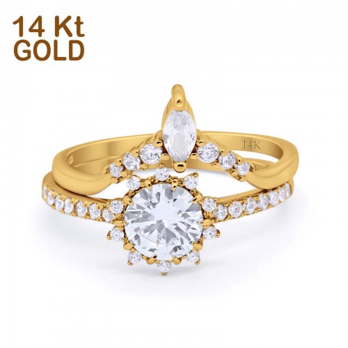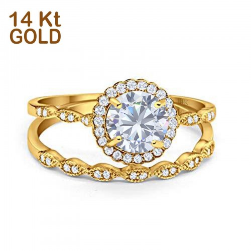 14K Yellow Gold Two Piece Art Deco Bridal Set Ring Band Round Engagement Piece Simulated CZ Size-7