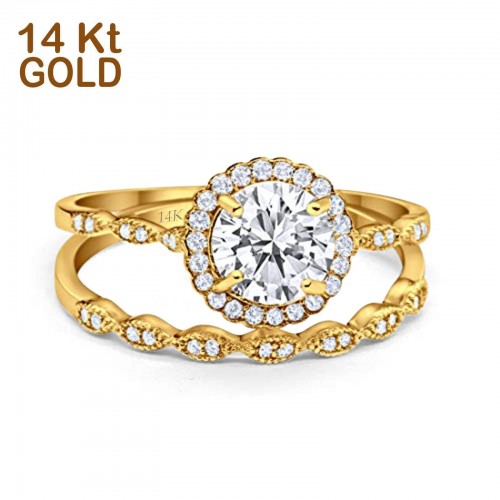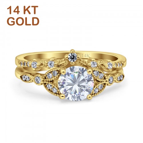 14K Yellow Gold Two Piece Vintage Style Bridal Set Round Simulated Cubic Zirconia Wedding Ring 7