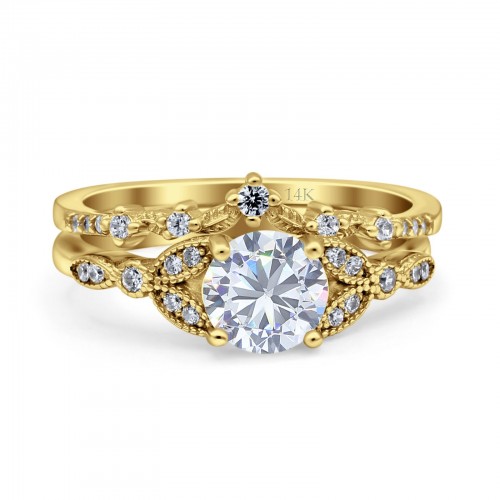 14K Yellow Gold Two Piece Vintage Style Bridal Set Round Simulated Cubic Zirconia Wedding Ring 7