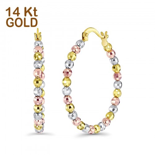 Solid 14K Tri Color Gold 3mm Thickness Beaded Hoop Earrings(30mm Diameter)
