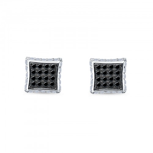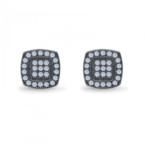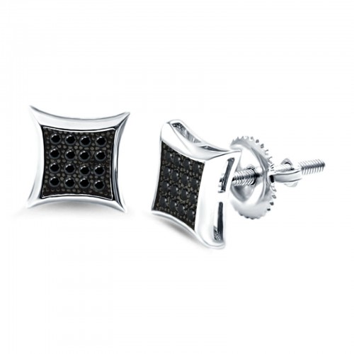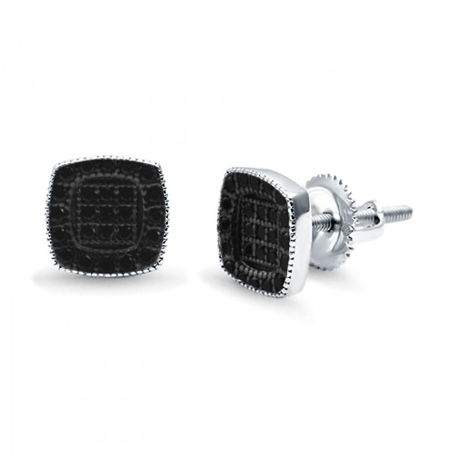 Square Cushion Shape Simulated Black CZ Stud Earrings Screw-Back Round Pave 925 Sterling Silver