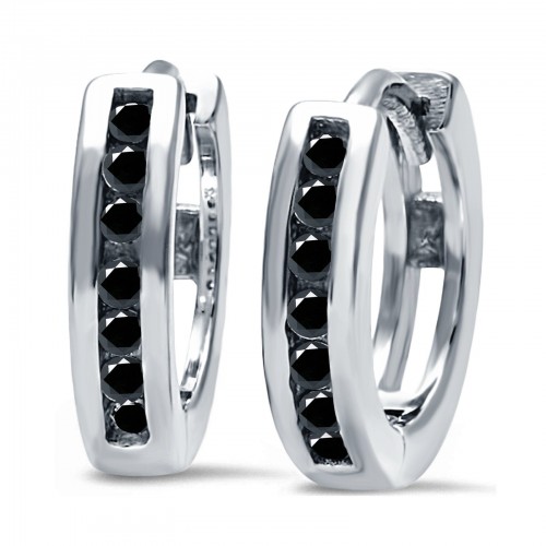 Eternity Huggie Hoop Earrings Channel Round Simulated Black Cubic Zirconia 925 Sterling Silver