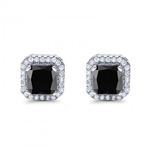 Halo Stud Earrings Wedding Princess Cut Simulated Black CZ Solid 925 Sterling Silver