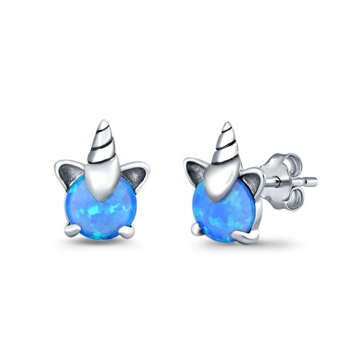 Unicorn Stud Earring Created Blue Opal Solid 925 Sterling Silver (9.8mm)