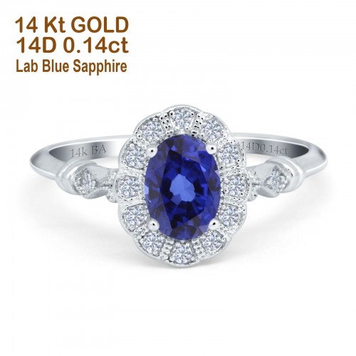 14K White Gold 0.9ct Oval 7mmx5mm G SI Nano Blue Sapphire Diamond Engagement Wedding Ring Size 6.5