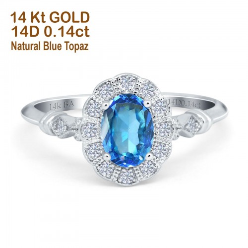 14K White Gold 0.9ct Oval 7mmx5mm G SI Natural Blue Topaz Diamond Engagement Wedding Ring Size 6.5