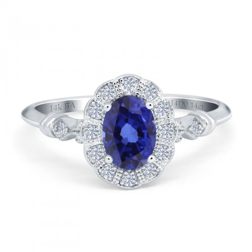 14K White Gold 0.9ct Oval 7mmx5mm G SI Nano Blue Sapphire Diamond Engagement Wedding Ring Size 6.5