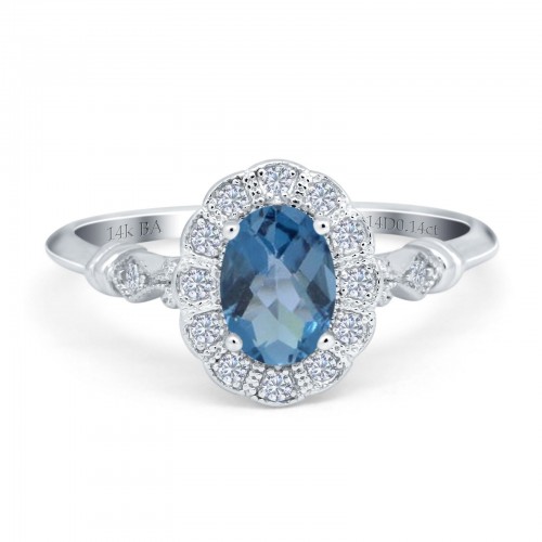 14K White Gold 0.9ct Oval 7mmx5mm G SI London Blue Topaz Diamond Engagement Wedding Ring Size 6.5