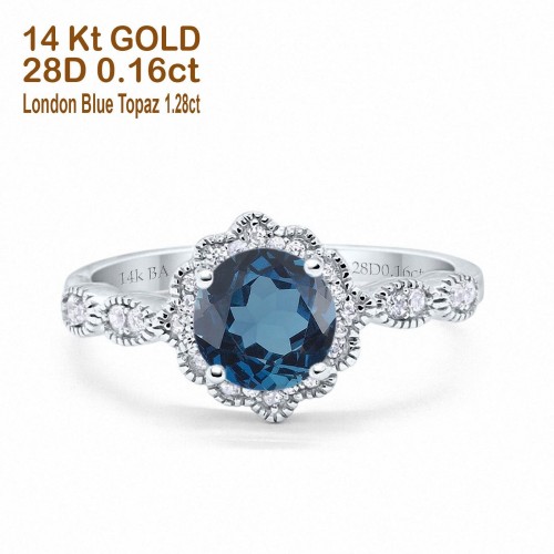 14K White Gold Round London Blue Topaz 1.44ct G SI Diamond Engagement Ring Size 6.5