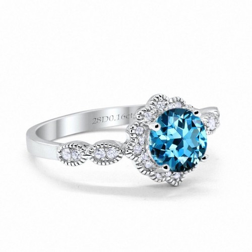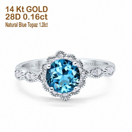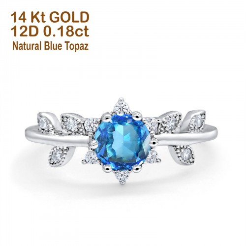 14K White Gold Round Natural Swiss Blue Topaz 1.44ct G SI Diamond Engagement Ring Size 6.5