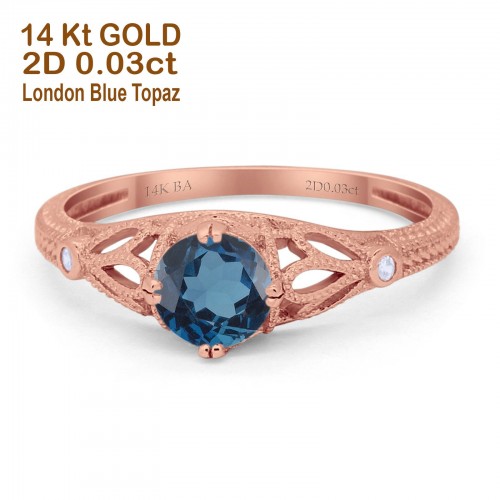 14K Rose Gold 0.87ct Round London Blue Topaz G SI Diamond Engagement Ring Size 6.5