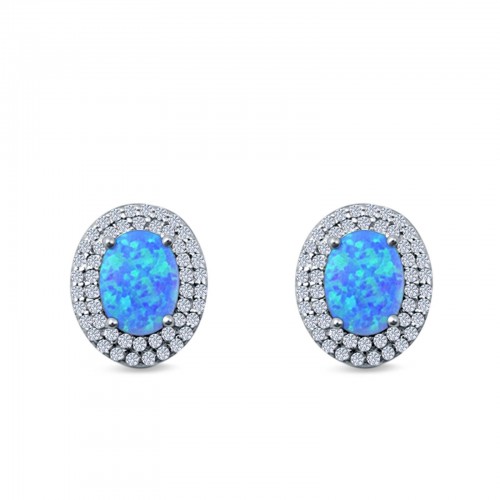 Double Halo Stud Earrings Oval Lab Created Blue Opal Simulated CZ 925 Sterling Silver