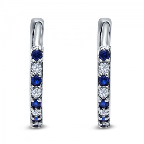Half Eternity Hoop Earrings Round Simulated Blue Sapphire Cubic Zirconia 925 Sterling Silver (14mm)