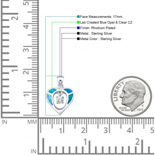Lab Created Blue Opal & CZ Heart Charm Pendant 925 Sterling Silver