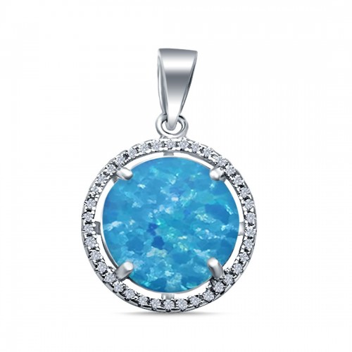 Lab Created Blue Opal Round Simulated CZ 925 Sterling Silver Charm Pendant