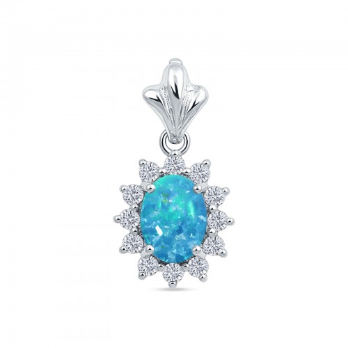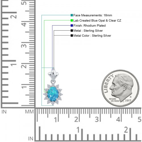 Oval Lab Created Blue Opal & CZ Floral Pendant 925 Sterling Silver