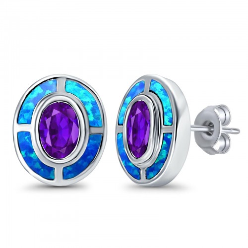 Oval Amethyst Stud Earrings Lab Created Blue Opal Simulated CZ 925 Sterling Silver (13mm)