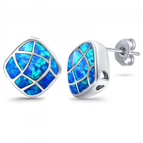 Solitaire Stud Earring Cushion Shape Lab Created Blue Opal 925 Sterling Silver (13mm)