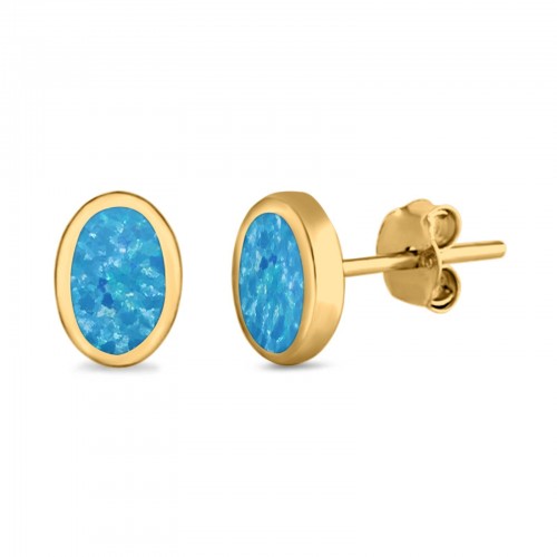 Solitaire Oval Stud Earrings Yellow Tone, Lab Created Blue Opal 925 Sterling Silver