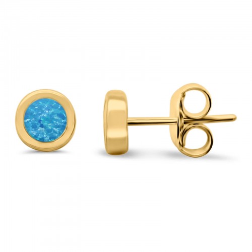 Solitaire Bezel Stud Earrings Round Yellow Tone, Lab Created Blue Opal 925 Sterling Silver(0.25mm)