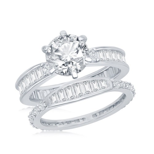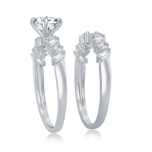 Sterling Silver Six-Prong Baguette CZ Band Engagement Ring Set