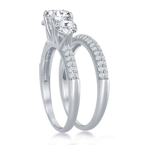 Sterling Silver Three-Stone Half Micro Pave Band Engagement Ring Set