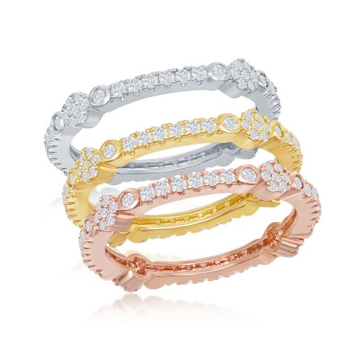 Sterling Silver Tri-Color Prong Clear CZ 1.5mm Eternity Triple Band Ring
