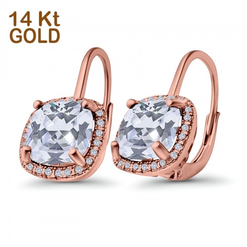 14K Rose Gold Cushion Halo Leverback Earrings Round Cubic Zirconia
