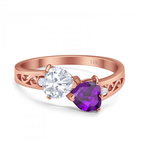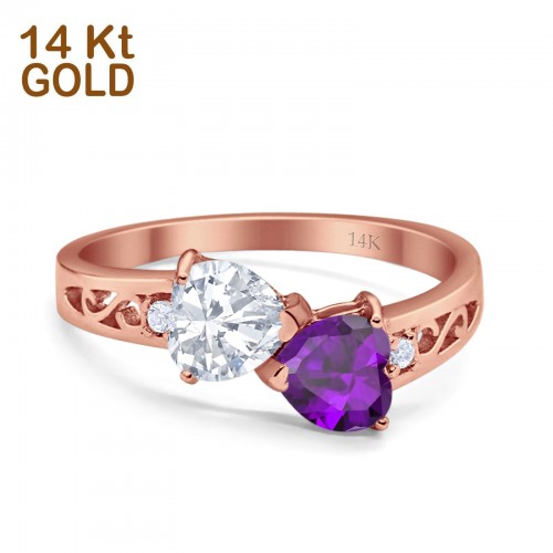 14K Rose Gold Double Heart Ring Bridal Wedding Engagement Ring Simulated CZ Size-7 14K Gold