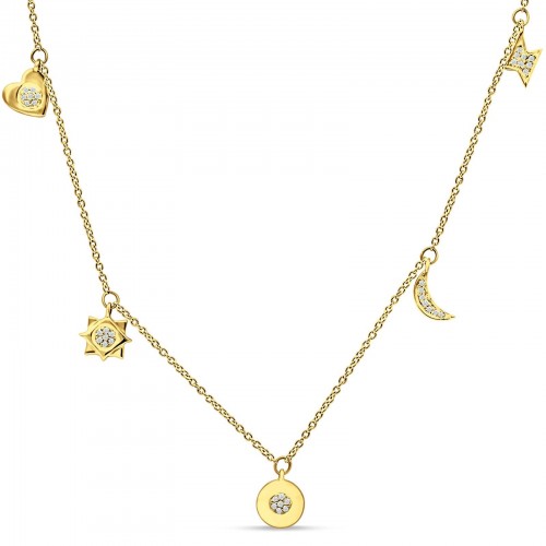 Dangling Moon Star Heart Diamond Necklace 14K Yellow Gold 0.07ct Wholesale