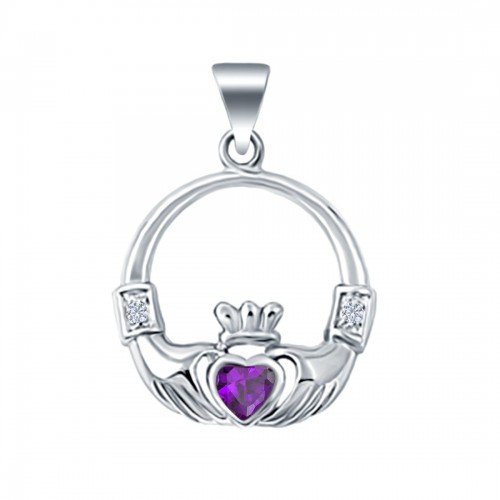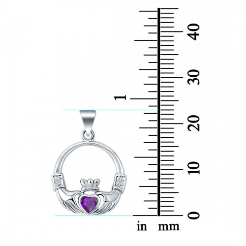 Silver Claddagh Charm Pendant Heart Simulated Amethyst CZ 925 Sterling Silver (23mm)