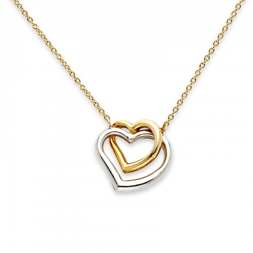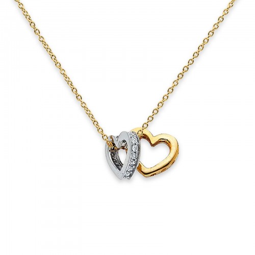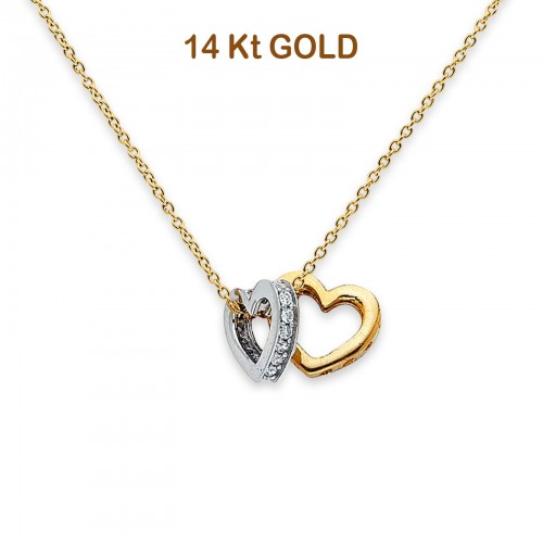 14K Two-Tone Gold CZ Double Heart Necklace – 17 + 1 Inch Extension