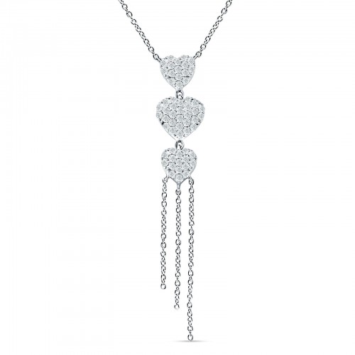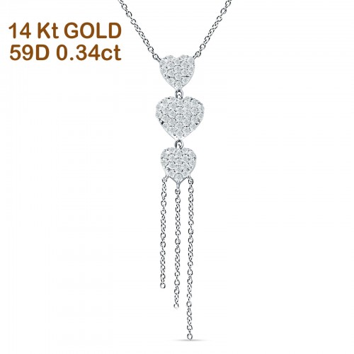 14K White Gold 0.34ct Three Heart Drop Necklace Round Diamond Pendant 16″ Long Wholesale