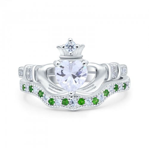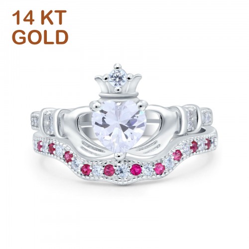 14K White Gold Heart Claddagh Art Deco Wedding Ring Simulated Cubic Zirconia Size-7 14K Gold