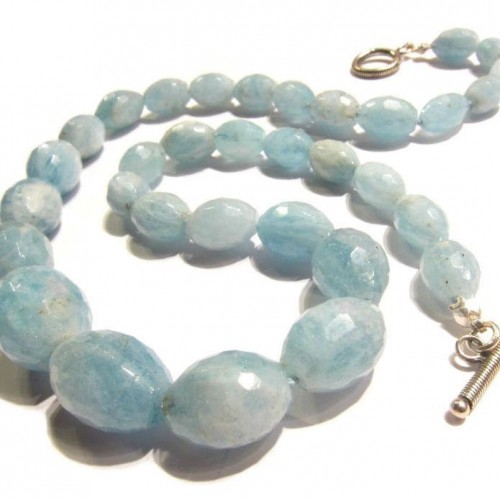 Faceted Graduated Aquamarine Barrels Knotted with Sterling Silver Toggle Clasp