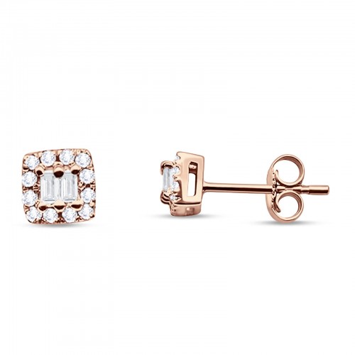 Solid 14K Rose Gold 5mm Modern Square Round Baguette Diamond Stud Earrings Push Back Wholesale