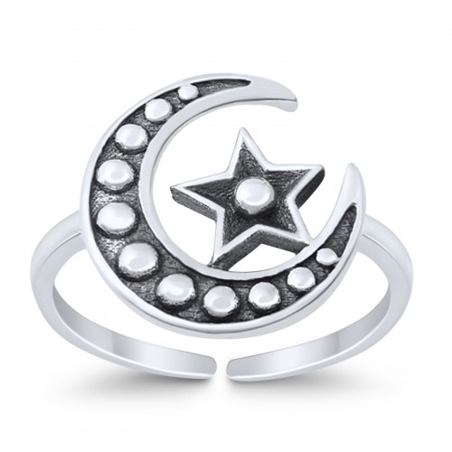Moon and Star Toe Ring Adjustable Band 925 Sterling Silver (7mm)