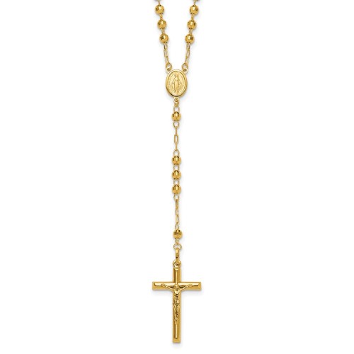 14k Polished Cross and Miraculous Medal with Diamond-cut Beads Rosary Necklace Plus Extender 17in