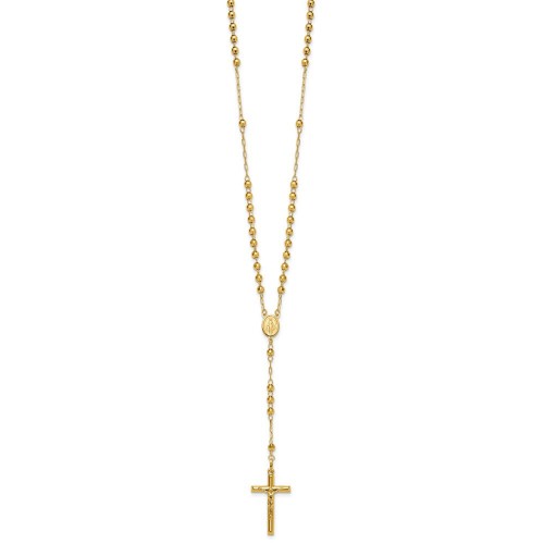 14k Polished Cross and Miraculous Medal with Diamond-cut Beads Rosary Necklace Plus Extender 17in