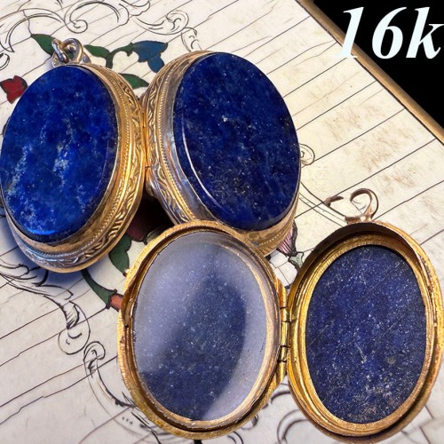 Antique 16k Gold Mounted Lapis Lazuli Mourning Memento Locket, Glass On One Side, c.1860s