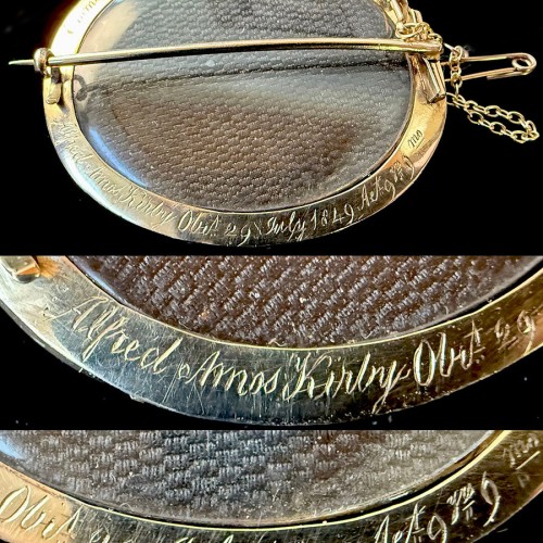 27.9 Grams Gross, 15.9 Grams 14k Gold Brooch, Antique c. 1849, Engraved Memento of 2 Children