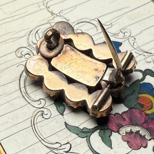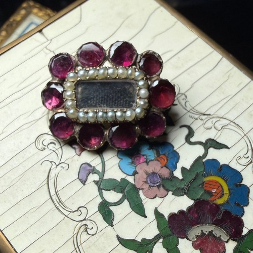 Antique 12k Gold and Seed Pearl, Garnet Gem Locket Brooch, Mourning Pin Brunette Hair Art