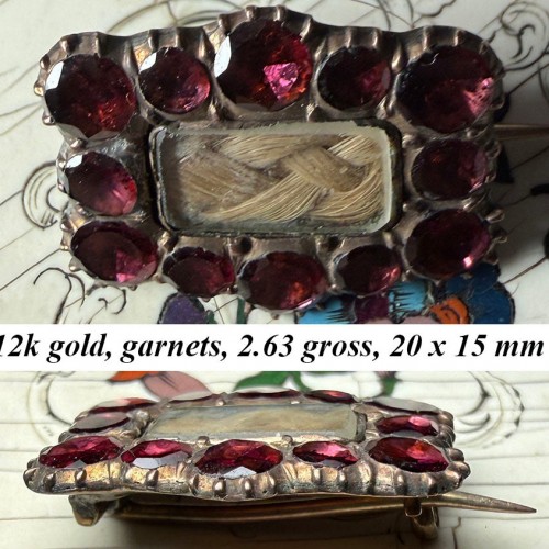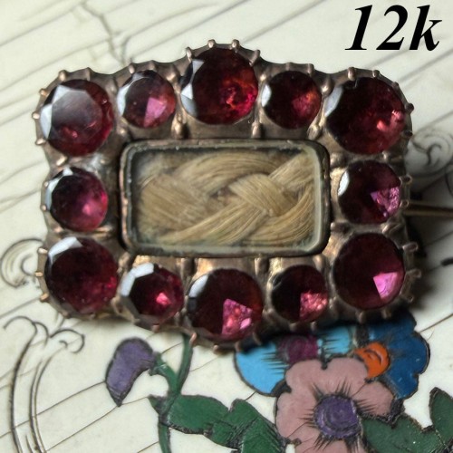 Antique 12k Gold and Flat Facet-cut Garnet Gem Locket Brooch, Mourning a Child, Blond Hair Art