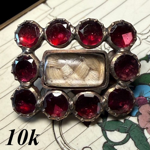 Antique 10k Gold and Flat Facet-cut Garnet Gem Locket Brooch, Mourning a Child, Blond Hair Art