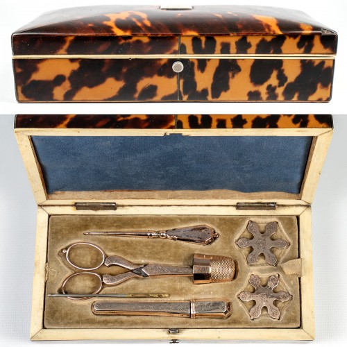 Antique 14k Thimble, 12k Sewing Tools, Fine Victorian Tortoise Shell Box, Case, Etui c.1850s