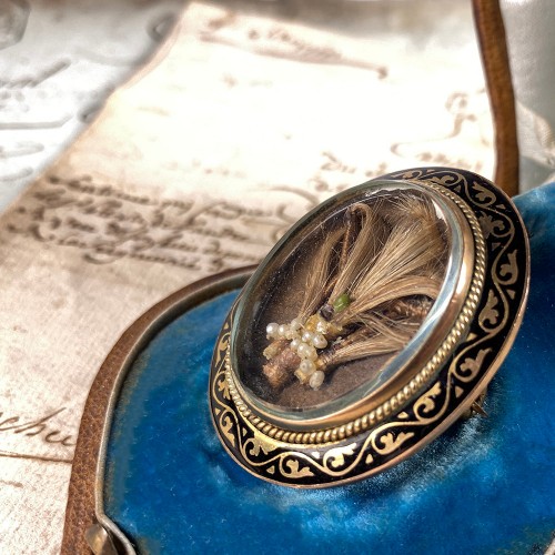 Elegant Victorian Era Mourning Brooch, 18k Gold Face, Kiln-fired Enamel, Hair Locket, Seed Pearls